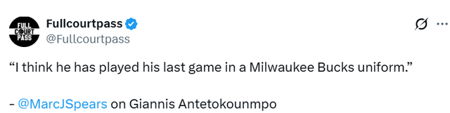 北京时间1月27日,雄鹿队球星字母哥正处于小腿拉伤的恢复期,此前他曾预估自己可能会缺阵4至6周,目前其确切复出时间仍未可知。名记Spears在节目上表示:“我认为他已经打完了身披密尔沃基雄鹿队球衣的最后一场比赛,”