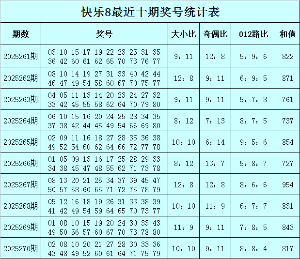 福彩快乐8第2025270期开奖回顾:02 08 10 20 21 27 28 30 33 36 43 48 49 52 60 61 64 71 75 79,其中奖号奇偶比开出9:11,大小比开出10:10,012路比开出8:8:4,和值为817,跨度为77。