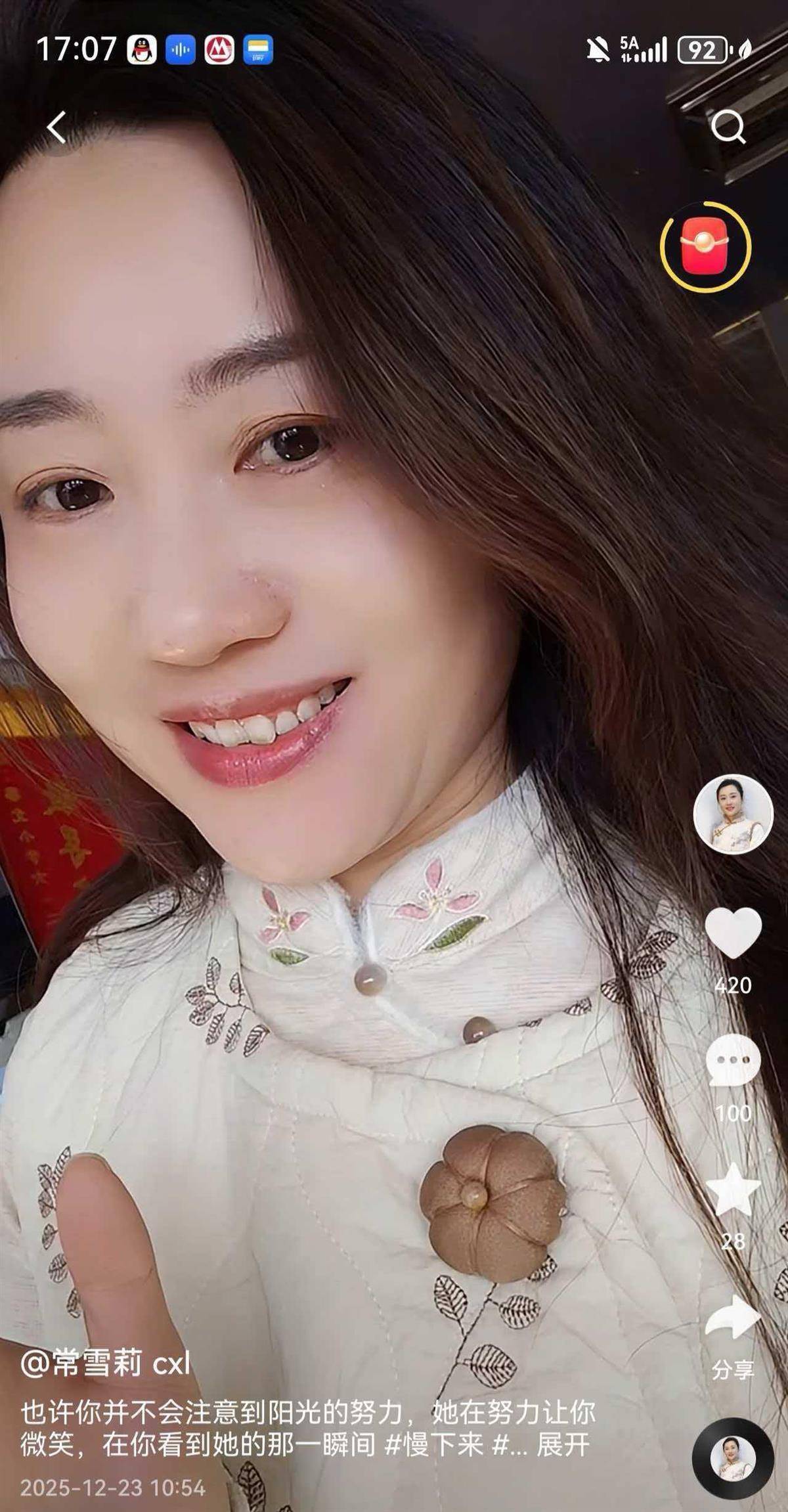 记者浏览常雪莉的社交账号发现,其美丽端庄的形象,总是呈现出一种积极向上的力量。她三年前曾说:“即使生活转成陀螺,也要让自己快乐起来。”最后一条视频停留在一周前的12月23日,她说:“你看,今天的阳光真好,你抬头,它就会对你笑,也许你并不会注意到阳光的努力,她在努力让你微笑,在你看到她的那一瞬间。”
