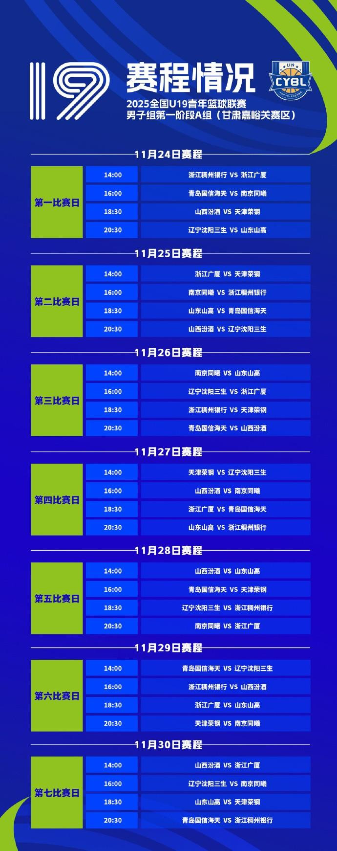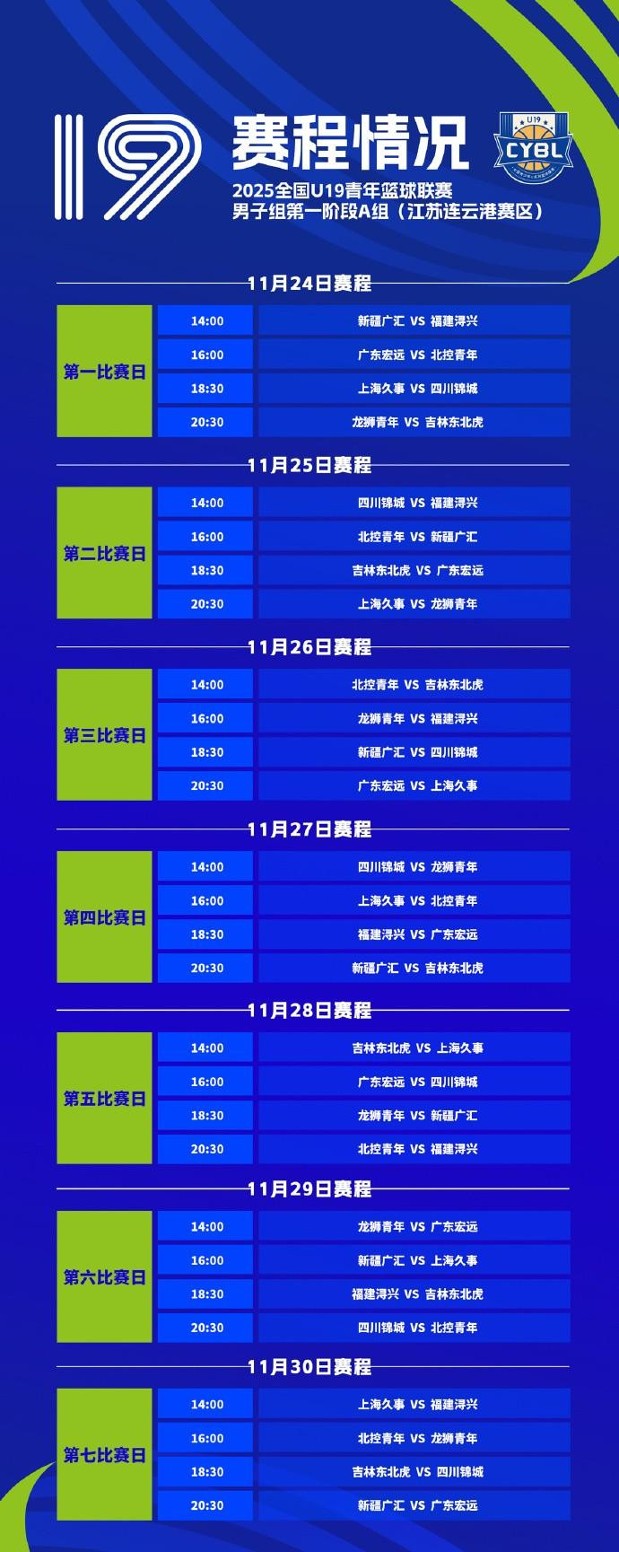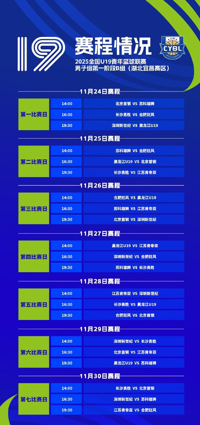 虎扑11月20日讯据全国青少年U系列篮球联赛官方消息,2025年全国U19青年篮球联赛男子组第一阶段赛程公布。