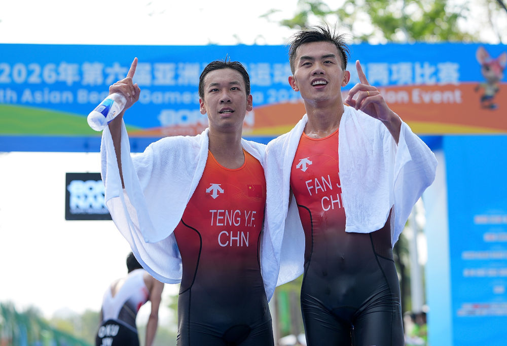 中国选手范俊杰(右)与队友滕云峰在冲线后合影。新华社记者 潘昱龙 摄
